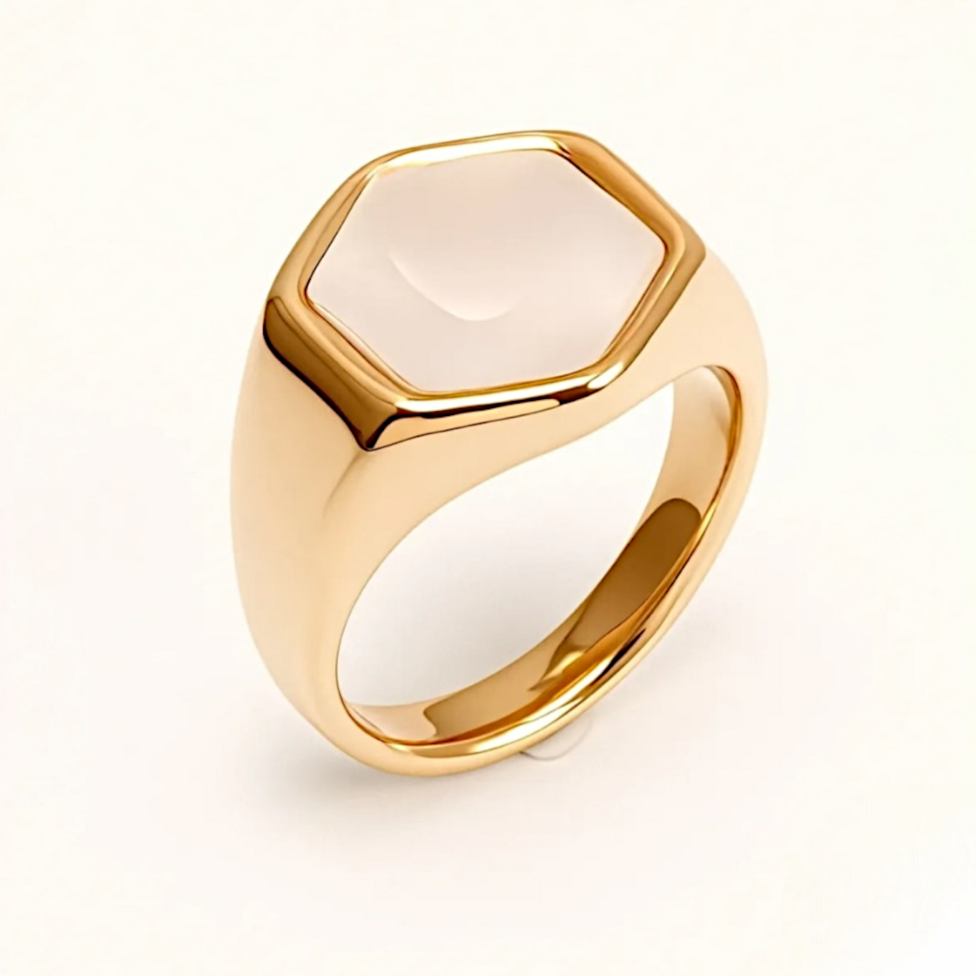 Shine bright with this stunning gold hexagon ring featuring a Mother-of-Pearl style face that catches the light beautifully—whether you’re poolside or conquering your day-to-day. Crafted from durable 316L stainless steel with a luxe gold PVD coating, this ring is built to last while staying hypoallergenic and water-resistant. Anti-oxidation technology ensures your piece keeps its radiant shine for years. At just .63" wide, it’s the perfect statement accessory—subtle when you want, dazzling when you don’t hold back.